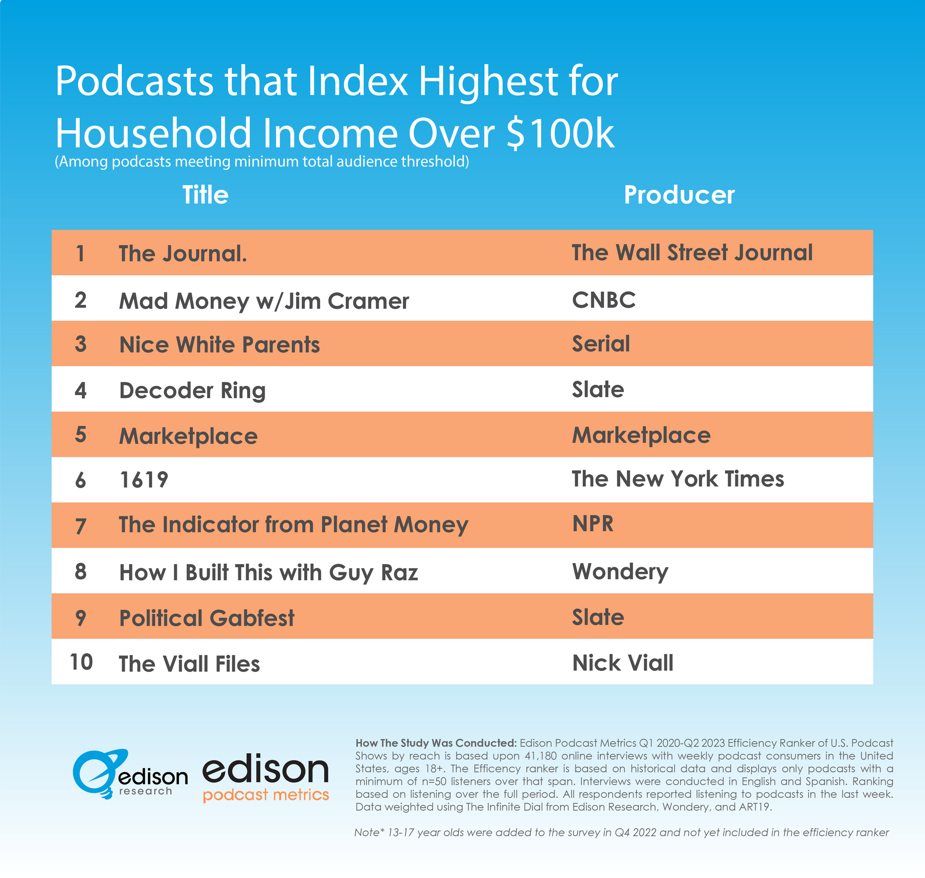 Edison Podcast Metrics has released data on which podcasts are most effective at reaching high-income listeners. Unlike other opt-in download counting services, Edison Podcast Metrics gathers data on every podcast listened to in the United States, and soon in the UK.