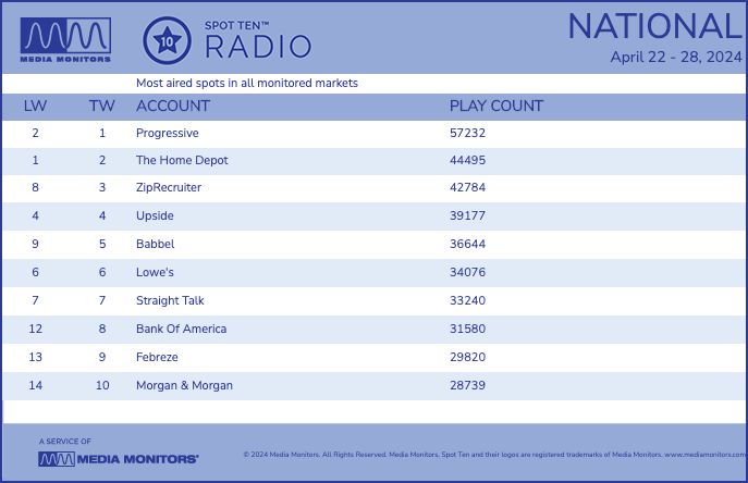 Spring fever could only hold Progressive Insurance out of the top spot for radio’s national advertisers for one week as the insurance giant retakes the lead. After a big week for home improvement brands and landscaping, the order has been shaken up, per Media Monitors data from April 22 to April 28.