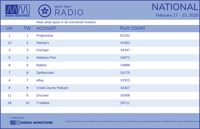 Progressive continues to be a clear front-runner, holding the number one position for another week while Grainger holds steady at number three, continuing its consistent investment in B2B radio advertising. Mattress Firm climbed one spot from fifth to fourth, likely tied to lingering marketing from Presidents Day sales.