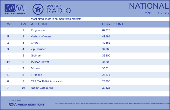 Progressive continued its reign as the top radio advertiser for the week of March 3-9, 2025, according to Media Monitors’ latest Spot Ten report. Yet the biggest ad story of the week was Jackson Hewitt, which surged to sixth as we enter the last month of tax prep.