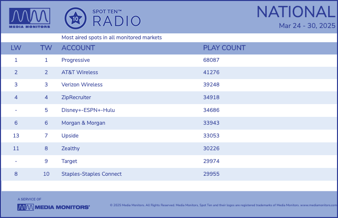 While wireless carriers and insurance giant Progressive continue to hold sway over the top of the rankings, Disney is the only entertainment streaming brand in the top five this week. The effort highlights a broader trend of cross-channel marketing, where even digitally native services are turning to legacy platforms like radio to build awareness and drive conversions in key local markets.