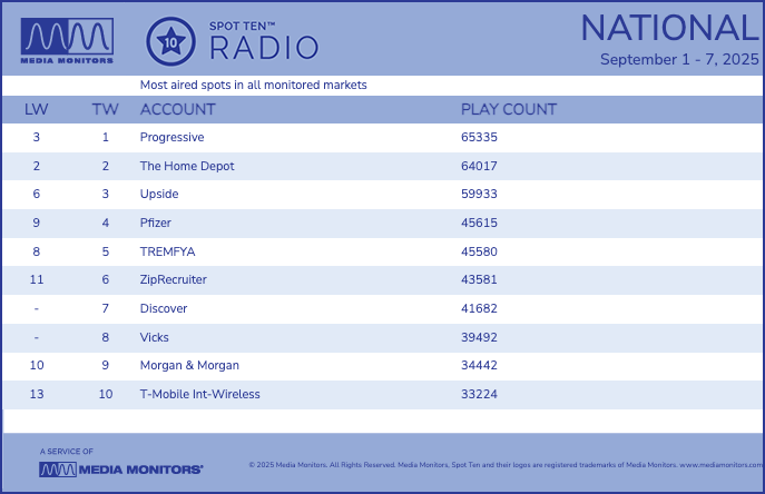 Progressive returned to the top of Media Monitors’ Spot Ten Radio rankings for the week of September 1–7. The insurer beat The Home Depot, which took second place, and is likely to disappear from the list until Black Friday. After leaping 75 spots, Sleep Number drifted out of the top ten entirely.