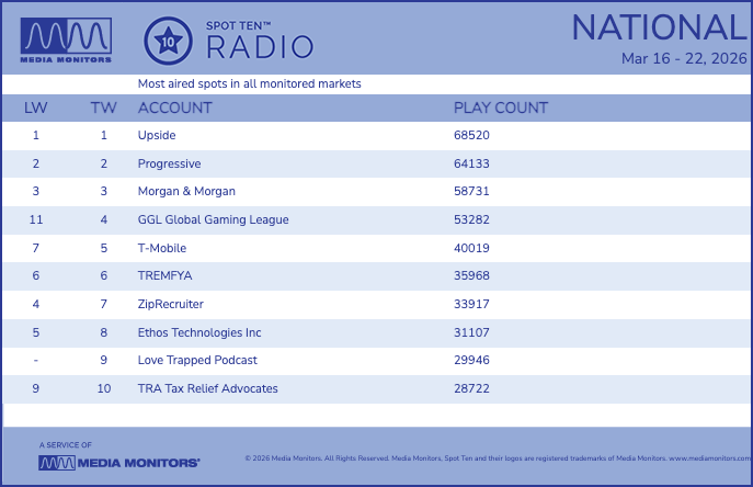 You’ve heard the ads if you listen to streaming audio or broadcast radio stations — a lot, in fact. Upside app spots have become ubiquitous, and for the week ending March 22 topped them all when it comes to spot play count as measured by iHeartMedia’s Media Monitors service.