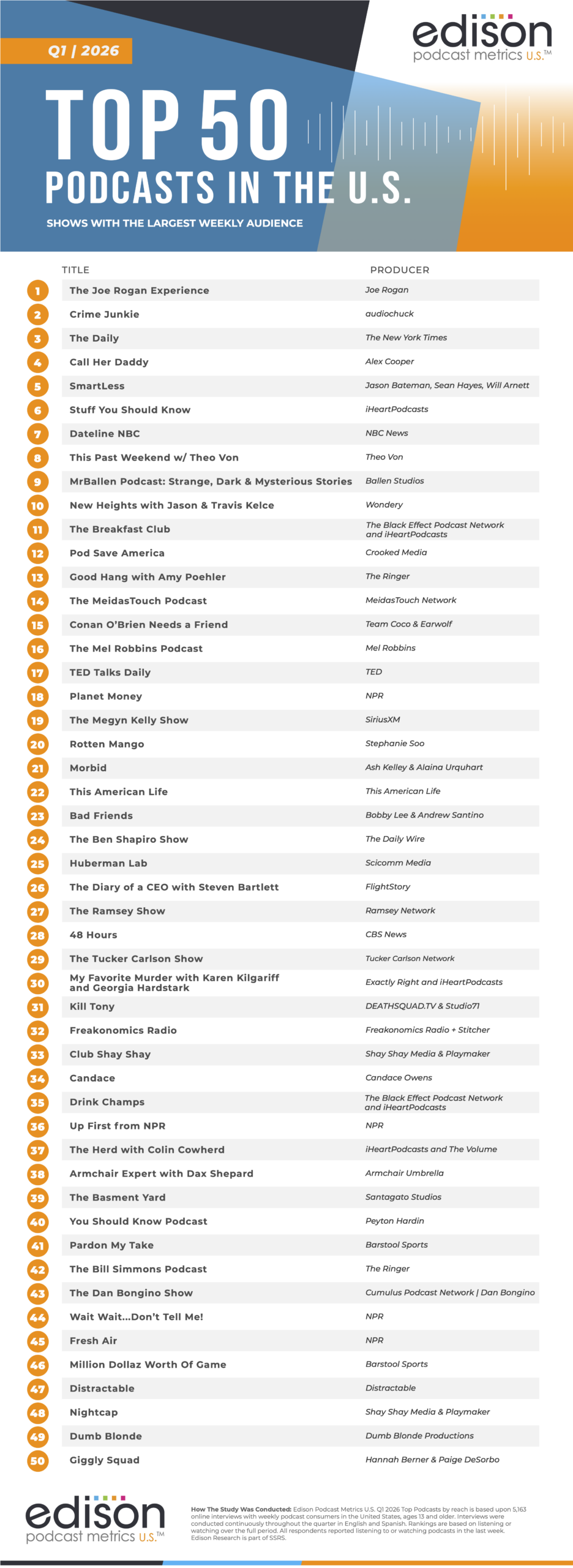 The top of the podcast charts hasn’t changed much, but plenty has shifted beneath it. Edison Research has released its Top 50 Podcasts in the US for Q1 2026, drawn from Edison Podcast Metrics and ranked by reach among weekly podcast consumers ages 13+.